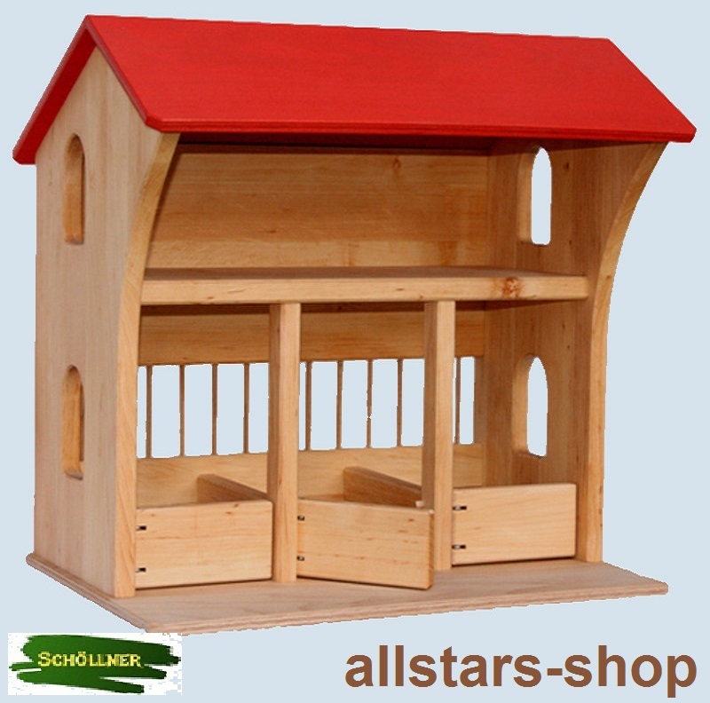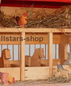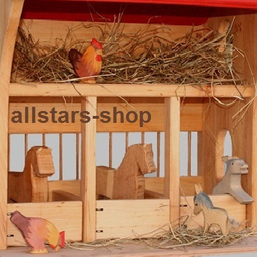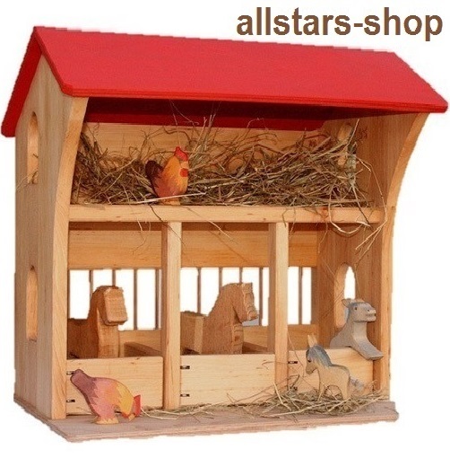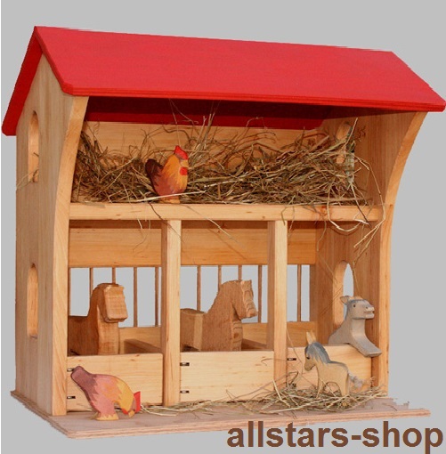 Der aus geöltem Erlenholz hergestellte Stall mit Pferdeboxen ist von vorne bespielbar. Auf der Empore kann das Stroh gelagert werden oder kann von der Bauernfamilie zum Wohnen genutzt werden.
