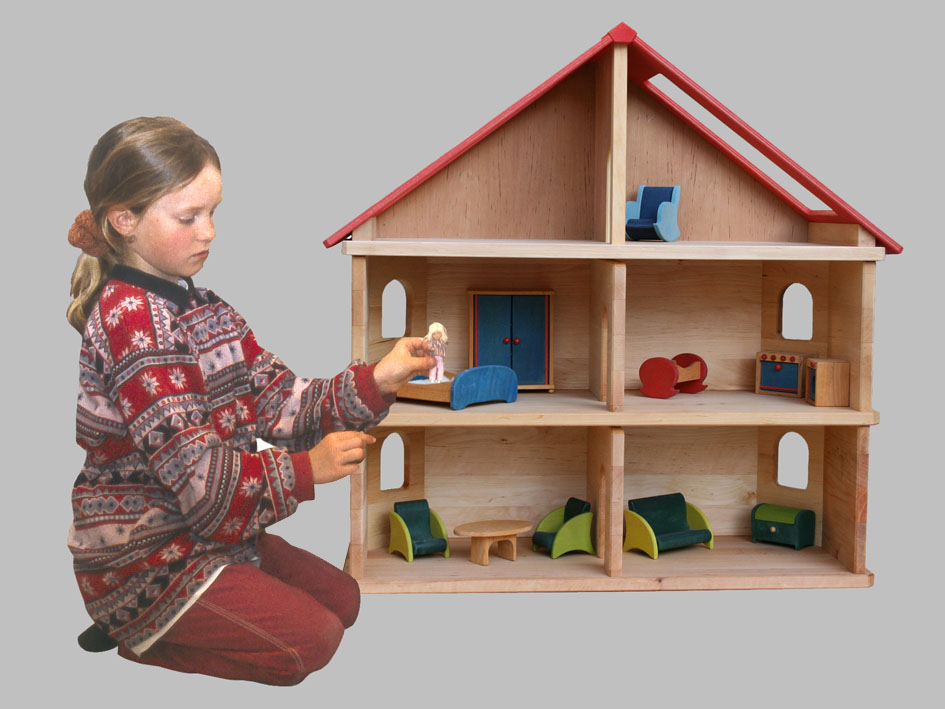 Die aus geöltem Erlenholz hergestellte Puppenstube lässt sich mit weiteren Etagen zu einem beliebig hohen Puppenhaus ausbauen. Werden die Stuben auseinander gestellt, so können sich die Puppen gegenseitig in ihren Häusern besuchen.