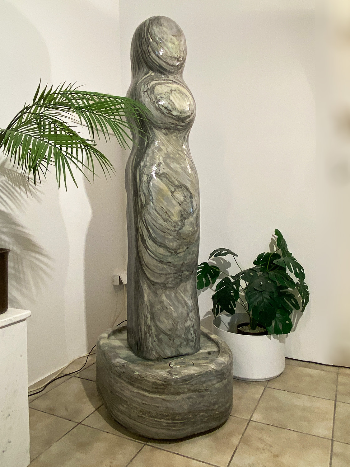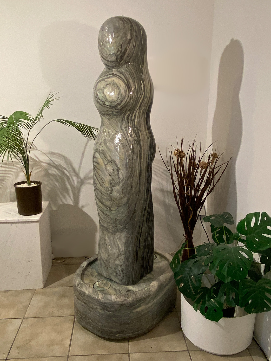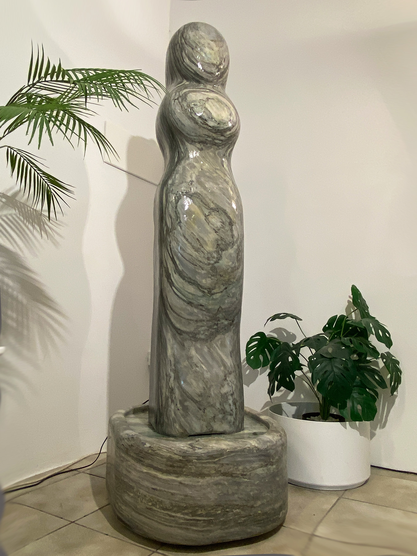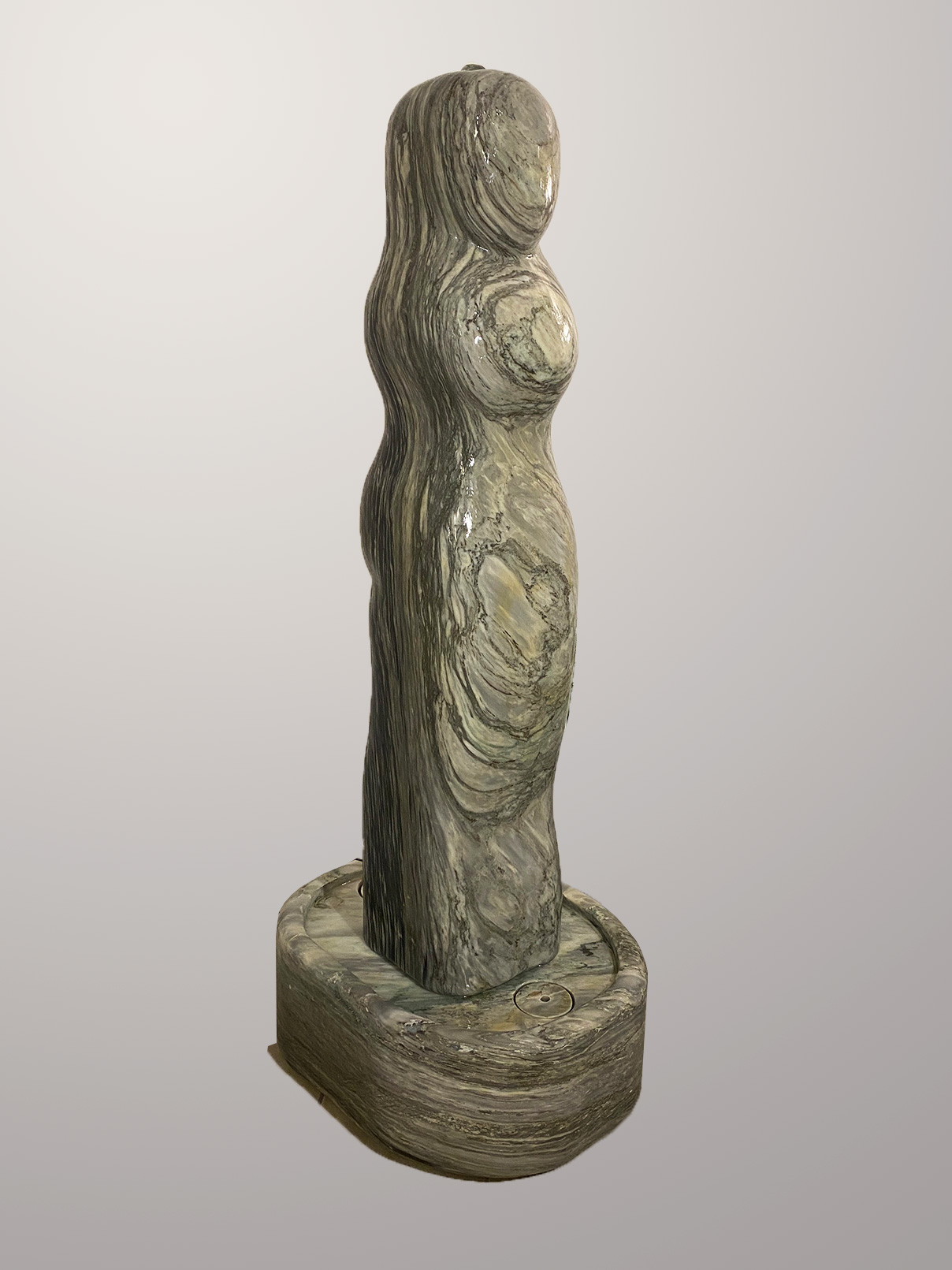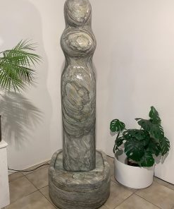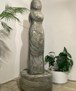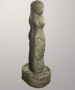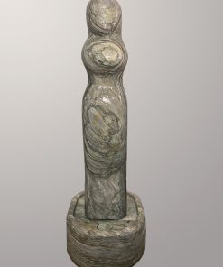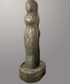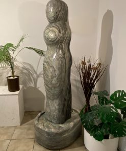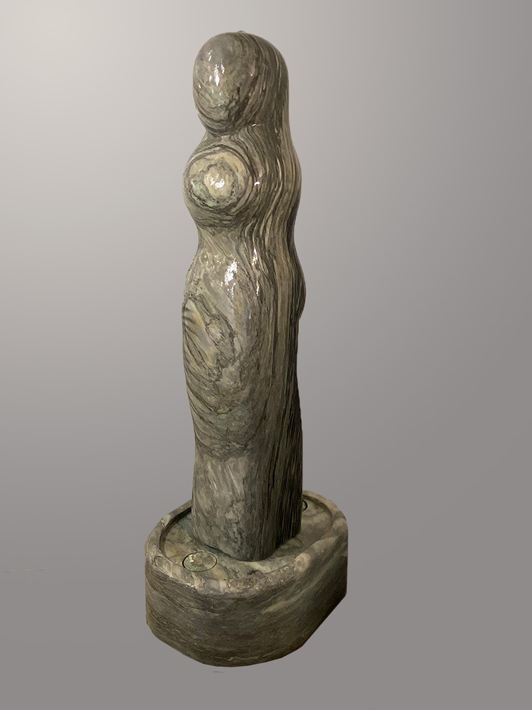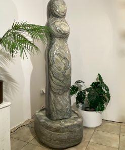 Das Oberteil dieses Kunstwerks zeigt die abstrahierte Form einer Frauenfigur. Die weichen runden Formen über die das Wasser sanft fließt bringen eine harmonische Atmosphäre in jeden Raum.