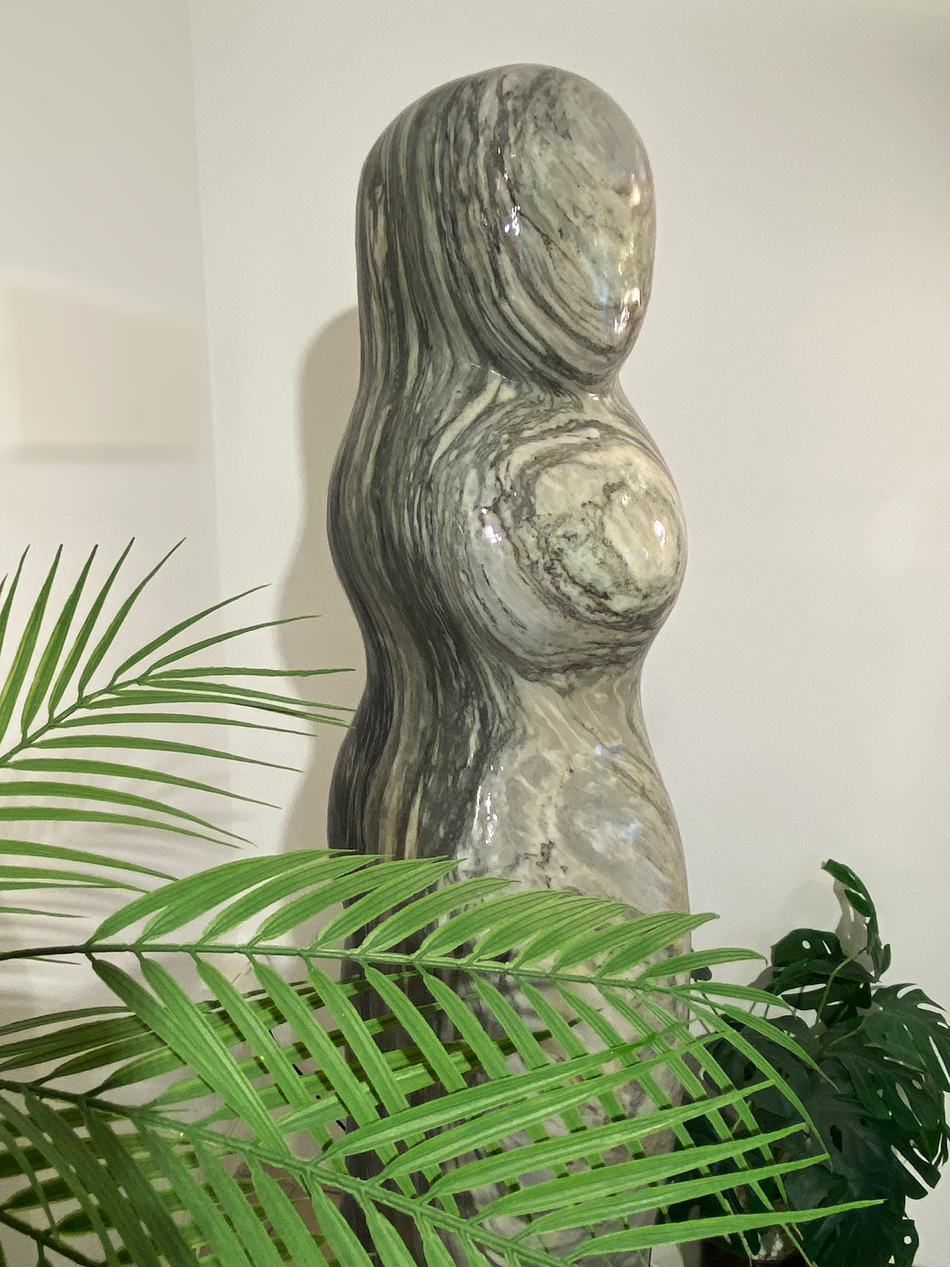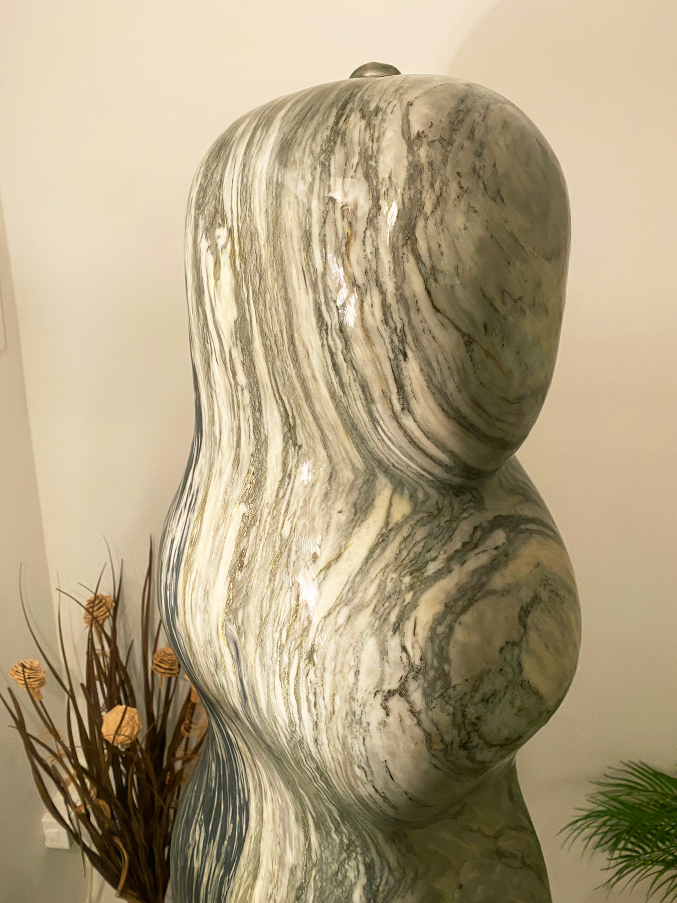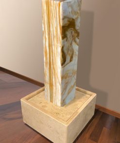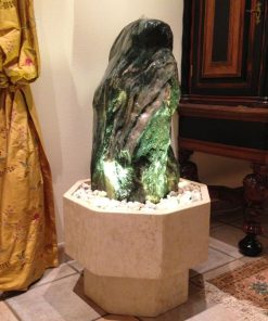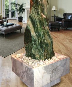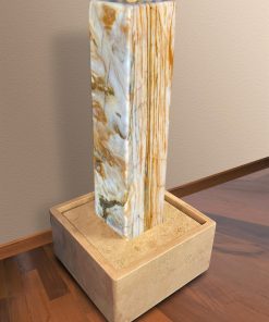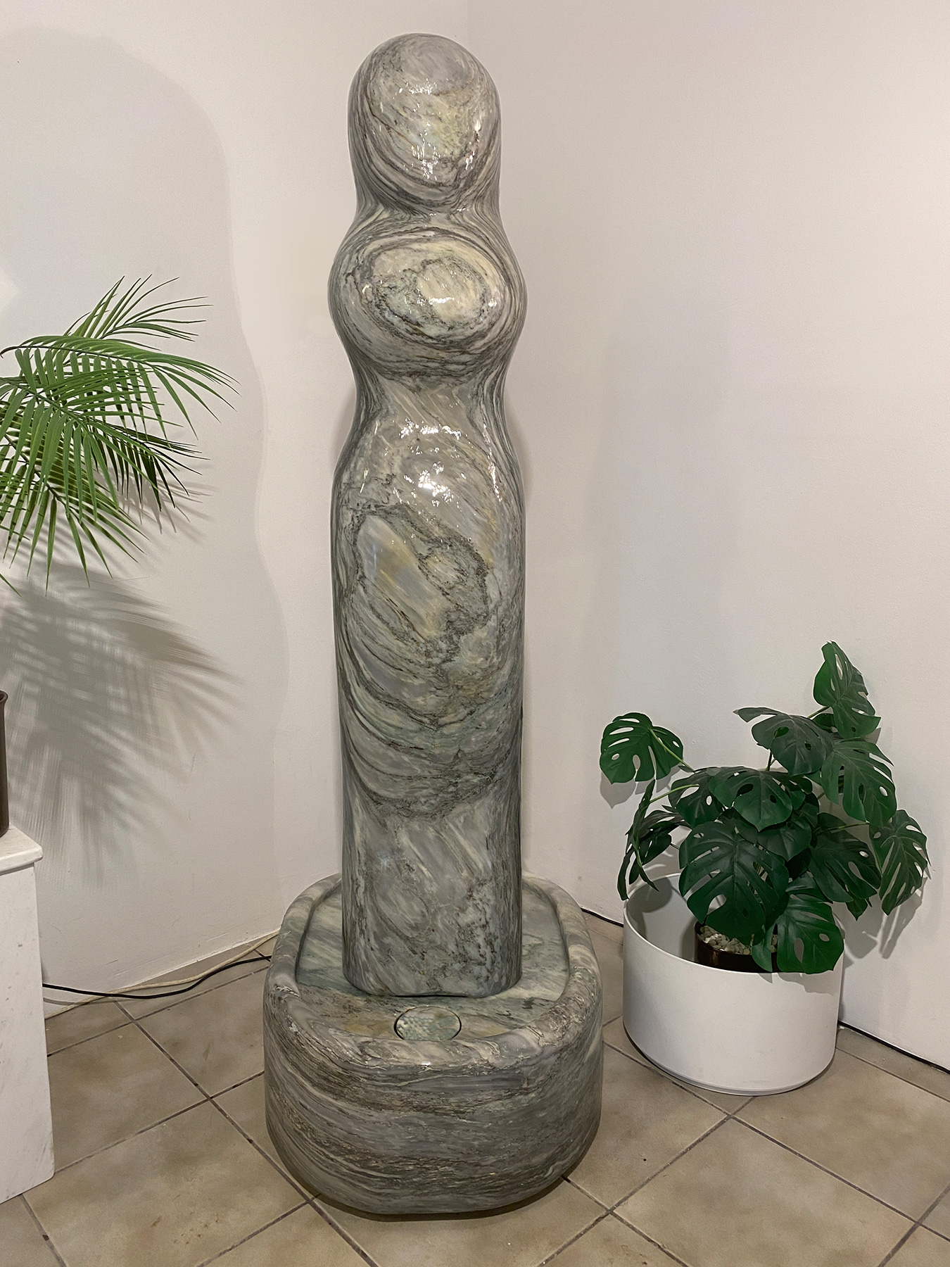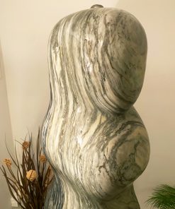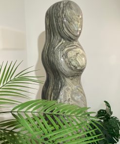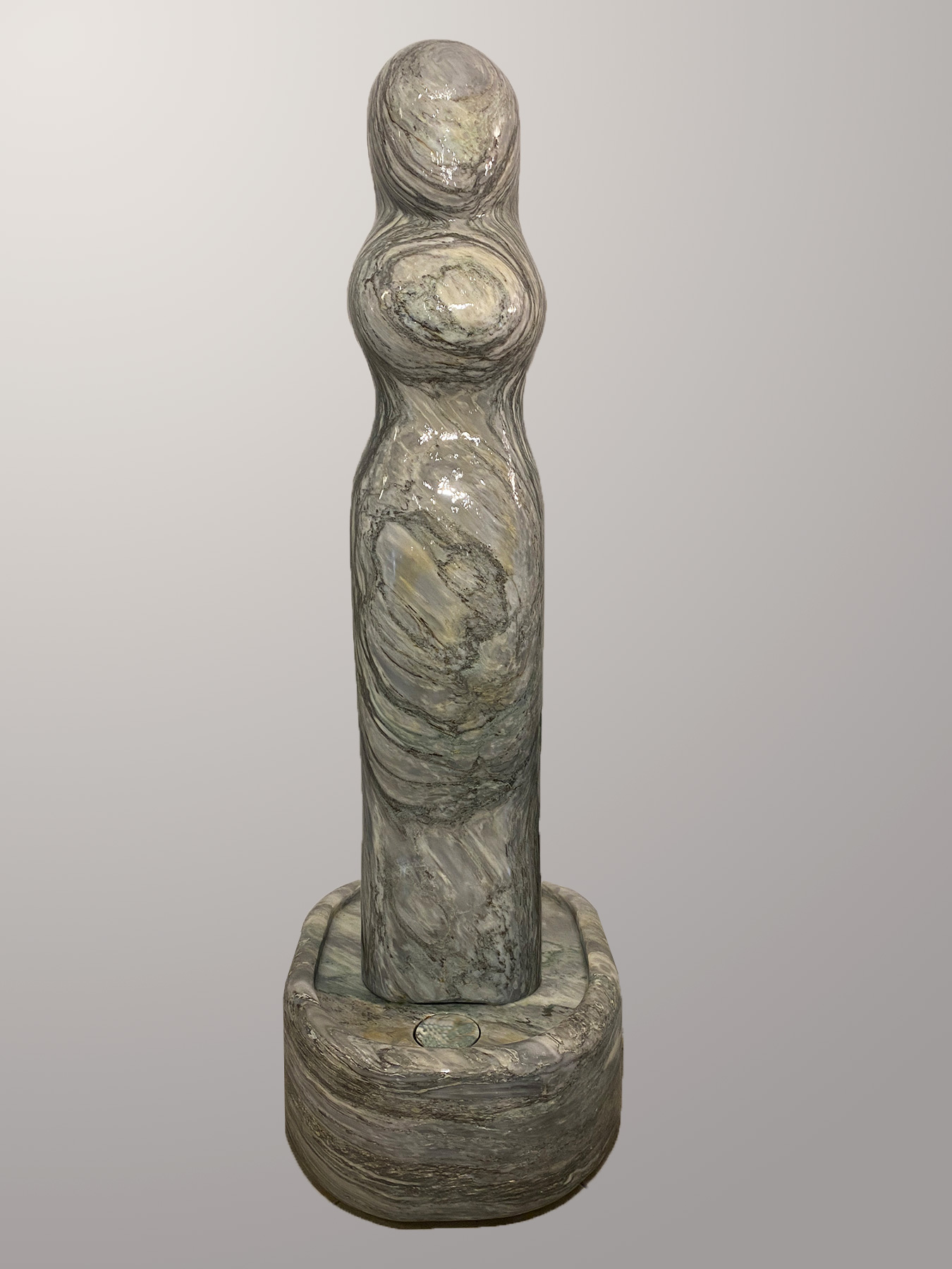 Das Oberteil dieses Kunstwerks zeigt die abstrahierte Form einer Frauenfigur. Die weichen runden Formen über die das Wasser sanft fließt bringen eine harmonische Atmosphäre in jeden Raum.