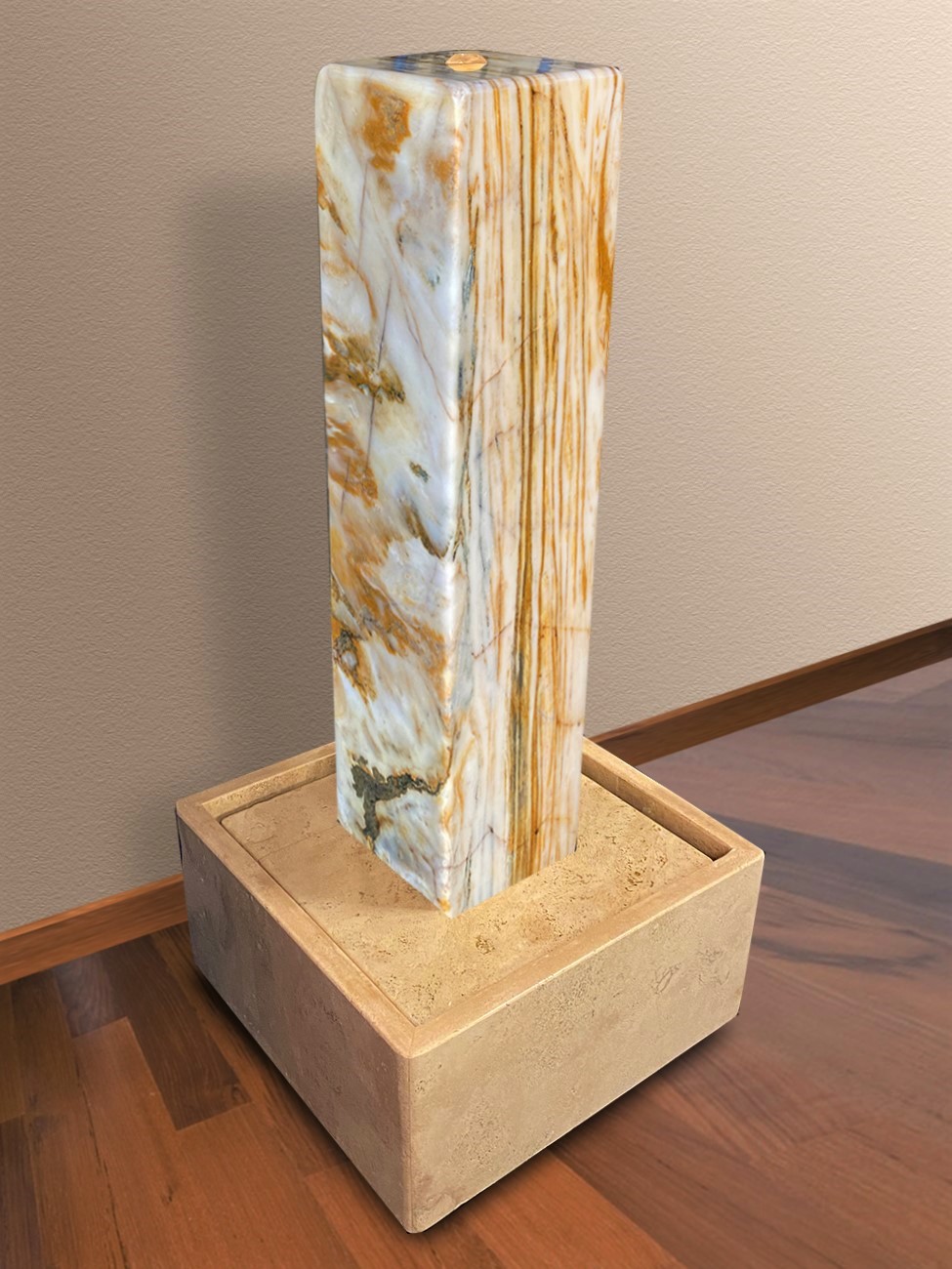 Die glatt geschliffene Marmor-Brunnenstele steht auf einem robusten Deckel aus Travertin. Der Deckel ist auf einer Seite mit einer Eingriffsklappe versehen, damit die Servicearbeiten ohne größeren Aufwand erledigt werden können und ohne dass der massive Stein bewegt werden muss.