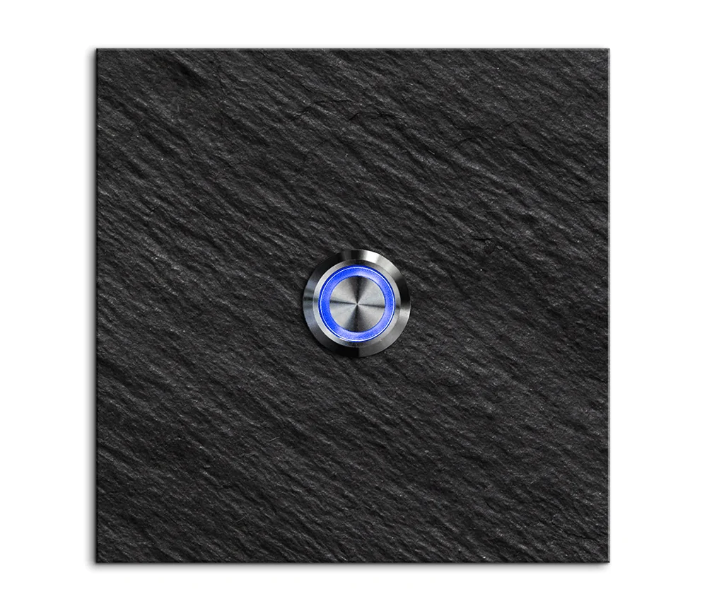 Die Klingel aus Naturschiefer wirkt rustikal und dennoch elegant. Der einzigartige Look dieser Natursteinplatten ist ein echter Blickfang an Ihrer Hauswand. Der Taster ist aus Edelstahl und wasserdicht (IP67). Durch unsere Premium Taster aus Edelstahl wird die Türklingel aus Schiefer noch luxeriöser. Werten Sie Ihre neue Klingel mit einem Taster mit einer LED Rinbeleuchtung auf. Zur Auswahl stehen verschiedene Farben (Weiß, Blau, Grün, Gelb und Rot). Die Montage des Klingelschildes ist mit ein paar Handgriffen leicht zu bewältigen. Zur Montage bieten wir eine Wandhalterung aus Edelstahl oder Silikon an. Als Tipp können wir Ihnen eine Edelstahlplatte als Dekorplatte empfehlen. In der Kombination aus dunklem Schiefer und einer hellen Edelstahlplatte werten Sie die Schieferplatte auf. Entsprechende Angebote oder auch fertige Türklingel-Sets finden Sie in unserem Shop.