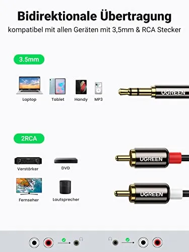 - Bidirektionales 2RCA auf 3,5mm Kabel: UGREEN Klinke auf Cinch Kabel macht es einfach und leicht, die 3,5mm-Stecker Geräte wie Handy, PC, Tablet oder MP3-Player usw. mit 2 RCA-Anschlüssen (Rot und weiss) wie Lautsprecher, TV, Verstärker, Soundbar, DVD-Player usw. zu verbinden.