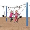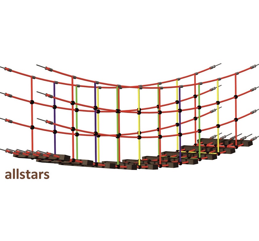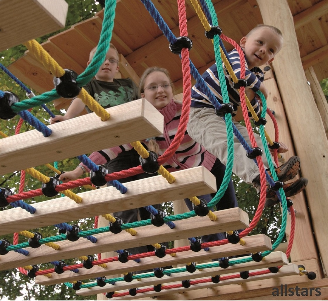 Die Hängebrücke mit Holzsprossen von hoher Qualität, nahezu unverwüstlich und extrem witterungsbeständig und zählt somit stabilsten Seilbrücken, die es zur Zeit am Markt gibt. Die Seile dieser, für die Kindergärten und für öffentliche Spielplätze sehr beliebten Hängebrückenserie, sind hergestellt aus 16 mm starken Herkules 4-schäftigen USACORD Long-Life-Seilen mit Stahlseele. Diese festen Holztrittflächen mit den farbigen und robusten Seilen bilden eine homogene und optisch ansehnliche Verbindung.