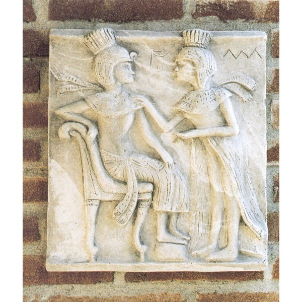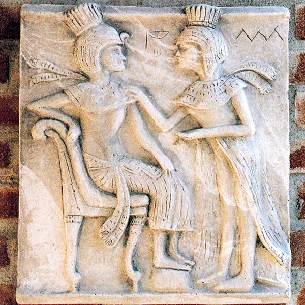 Diese Relief zeigt eine ägyptische Szene. Zwei detailreich gestaltete und reich geschmückte Personen unterhalten sich im Vertrauen.