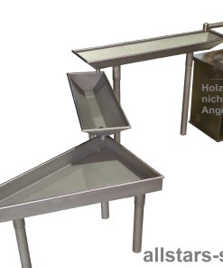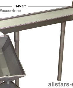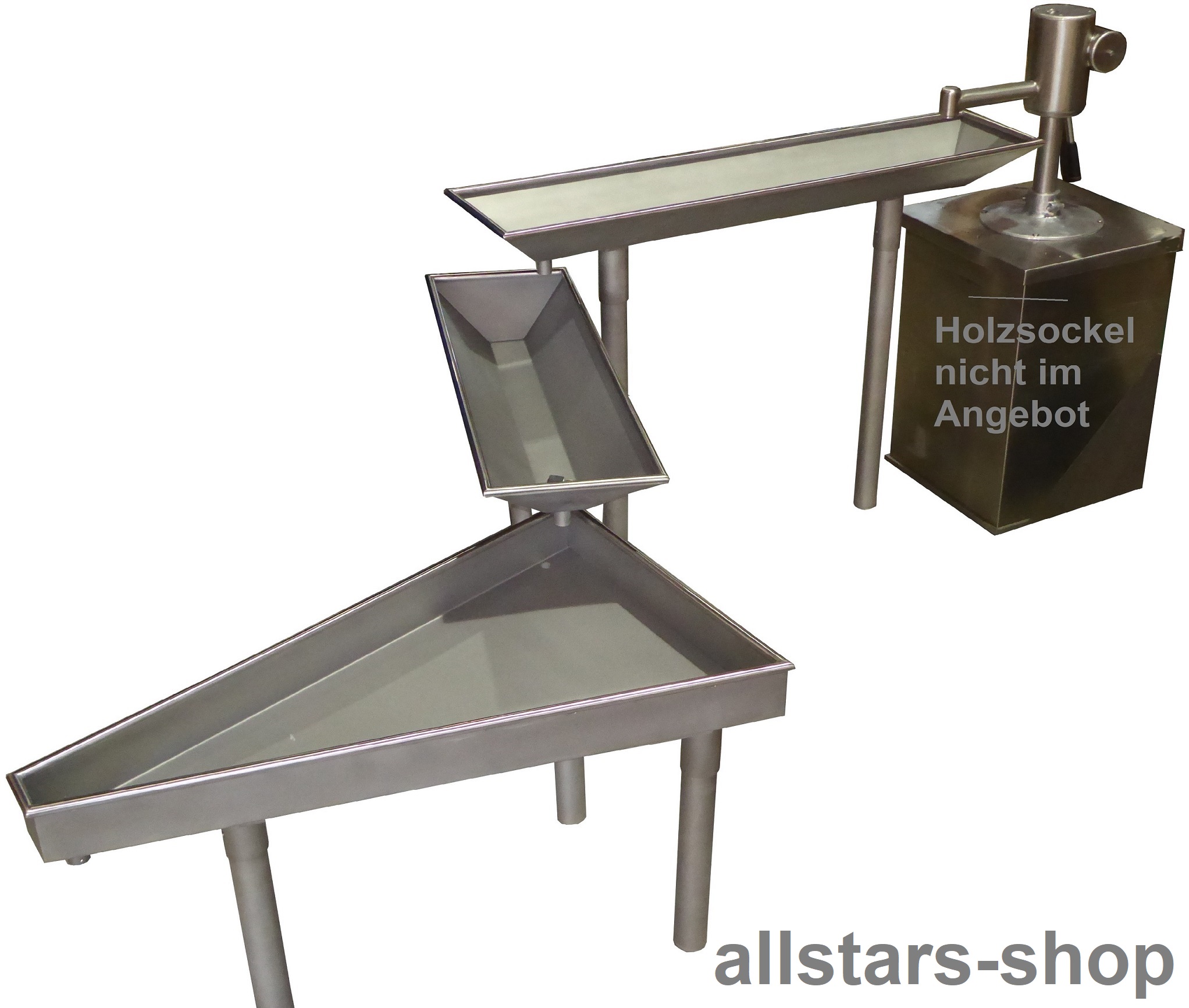 Diese Wasser-Rinnenanlage bietet die Möglichkeit in Verbindung mit dem passenden Spielplatz-Matschtisch eine Wasserfallanlage zu konstruieren. Zwei verschiedene miteinander kombinierbare Wasserrinnen und ein Matschtisch sind lieferbar. Die mitgelieferten, mit Ketten gegen Verlust gesicherten, Abflußstopfen ermöglichen das Aufstauen des Wassers. Alle Außenkanten aus Edelstahlrohr aufgeschweißt und sind abgerundet. Zum Angebot gehören die Ständer aus Edelstrahlrohr. Zum Lieferumfang gehören die stabilen Ständer aus Edelstahlrohr. Die Elemente können in unterschiedlichen Höhen einzementiert werden, so daß das Wasser von einer Rinne in die nächste fließen kann. Die Füße bestehen aus stabilem Ø 60 mm Rohr, Höhe der Füße ca. 110 cm. Die Anlage ist auch für Rollstuhlfahrer nutzbar. Dank passender Abstände der Standfüße können auch Rollstuhlfahrer bequem an die Anlage heranfahren.