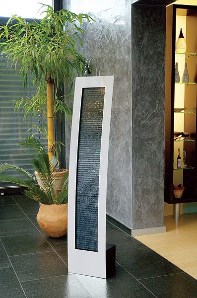 Das Wasser fällt über die ganze Breite schuppenartig herunter und ist dabei geräuschlos, was den besondern Anziehungspunkt dieses Objektes ausmacht. Zur Ausstattung gehören eine bewährte, geräuscharme Pumpe und eine indirekte Beleuchtung. Weiters unterstützt die Wasserwand eine medizinisch empfohlene Luftfeuchtigkeit von 45% – 55% zu erreichen.