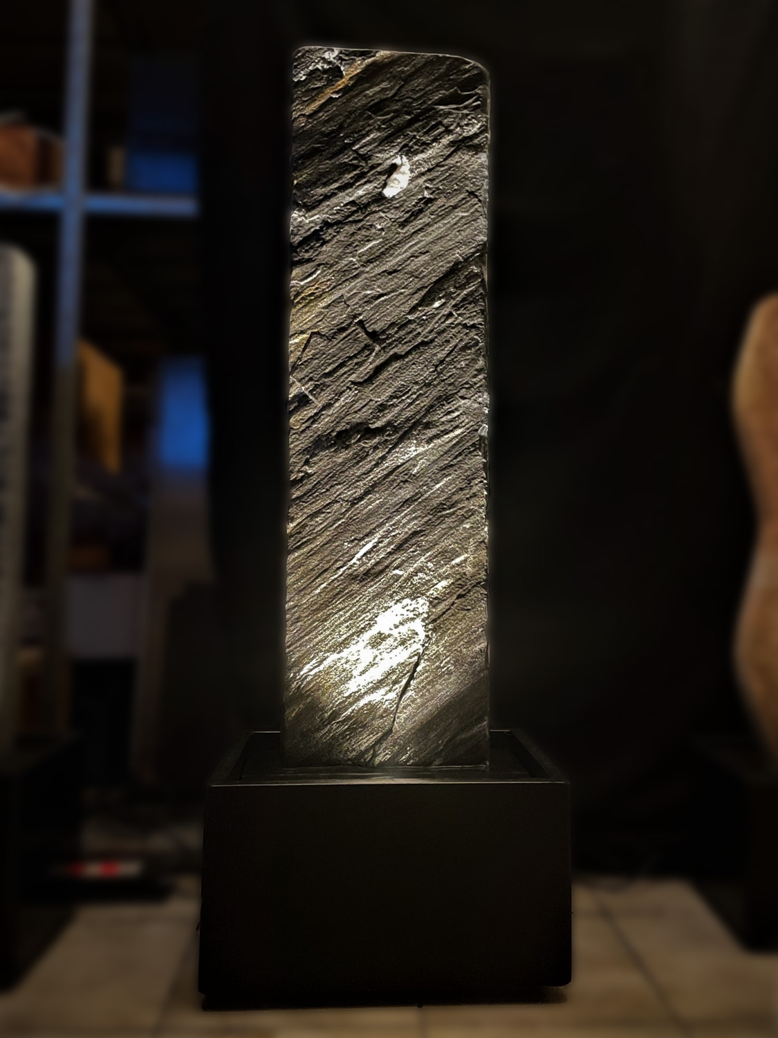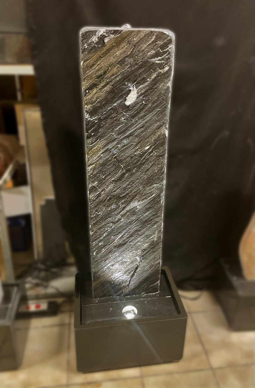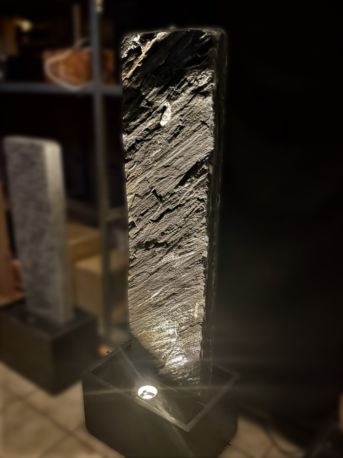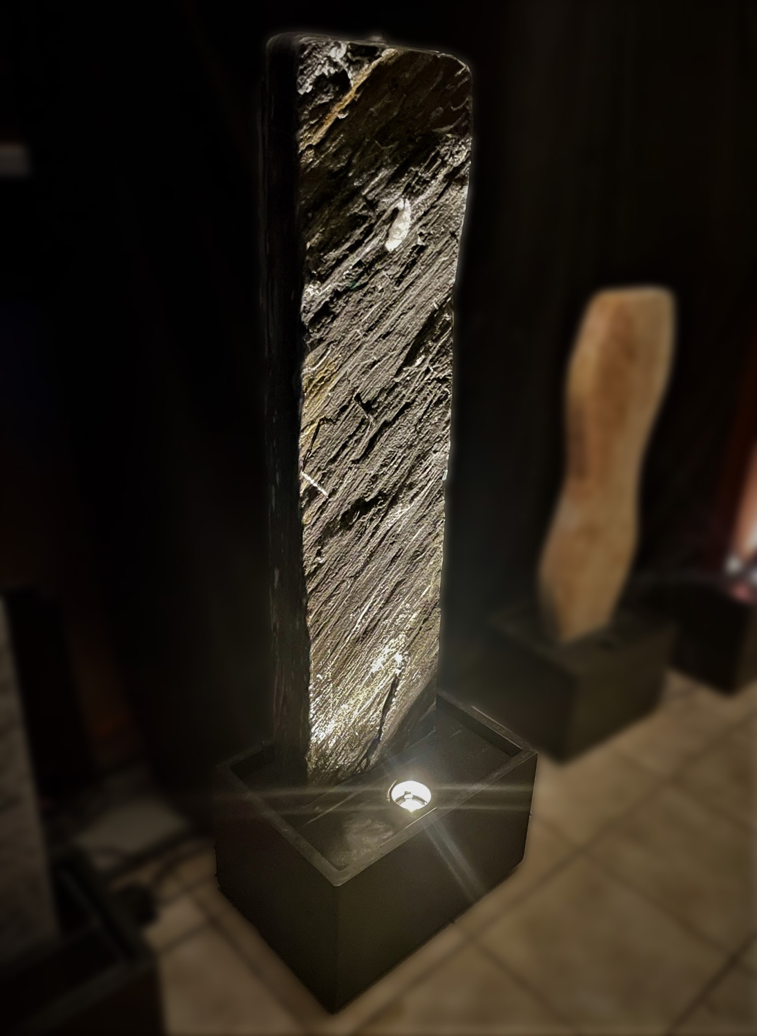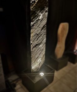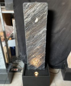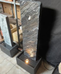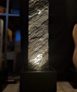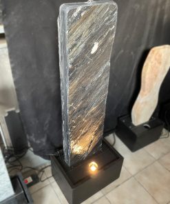 Der Brunnen besteht aus zwei Teilen. Der, mit der Standplatte verklebten Wasserwand, über die das Wasser sanft hinunter rinnt und der aus schwarzen Granit gefertigten Wanne, welche als Wasserreservoir dient. In der Granit-Wanne werden die Qualitätspumpe und auch der leicht zugängliche Unterwasserscheinwerfer platziert.