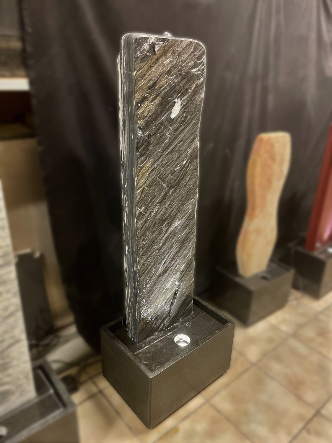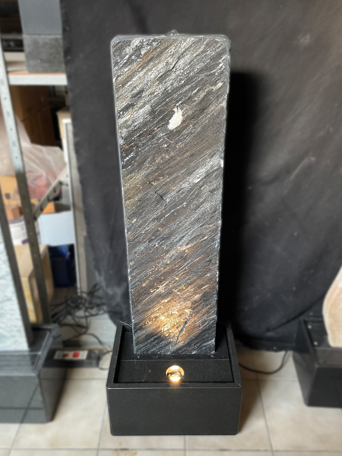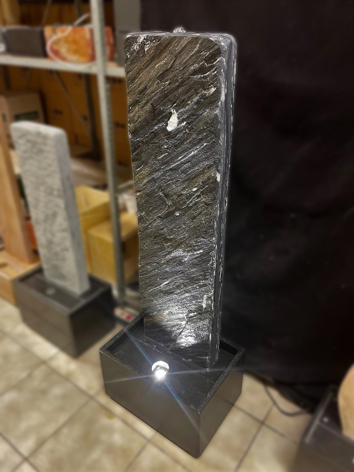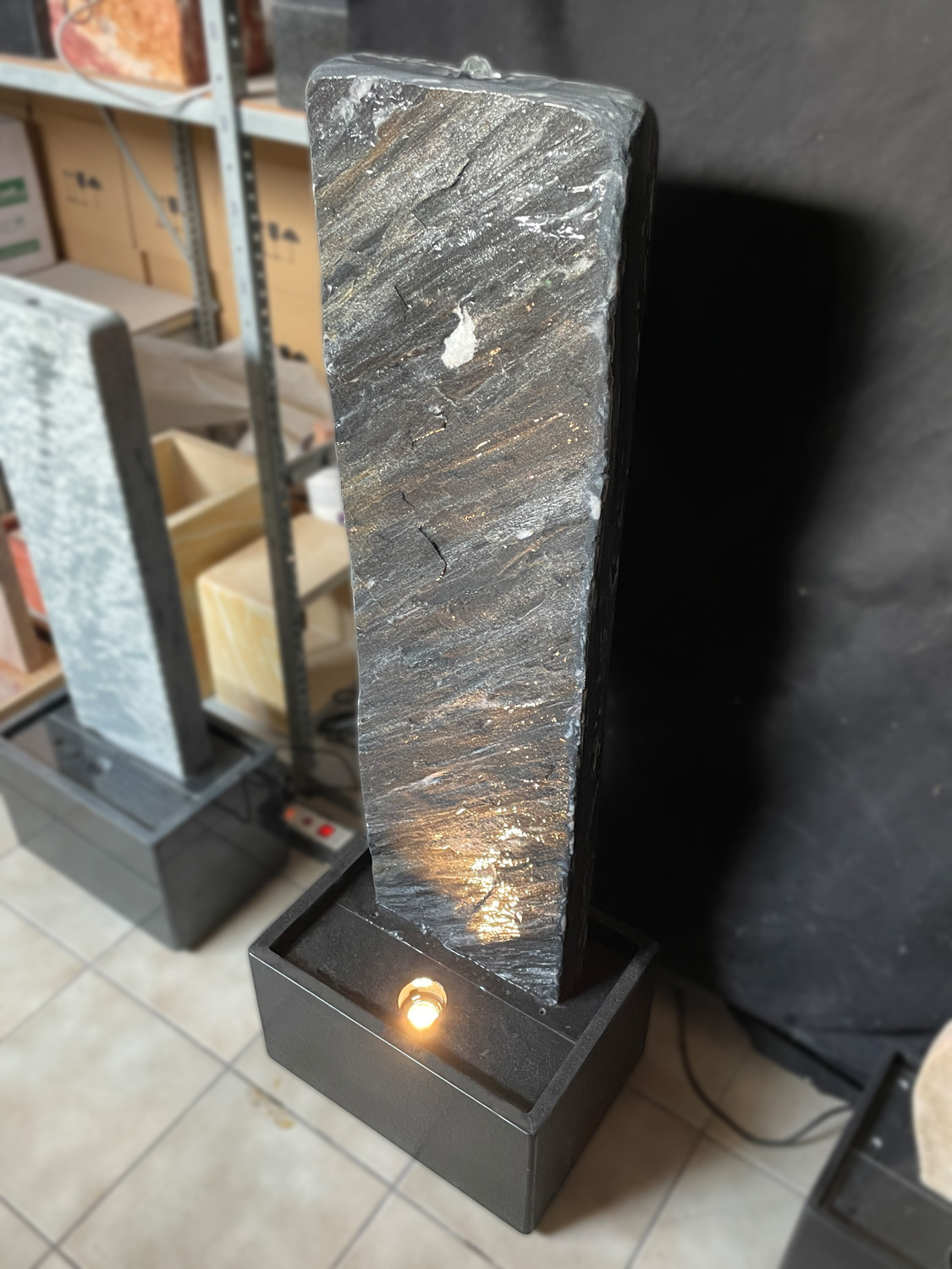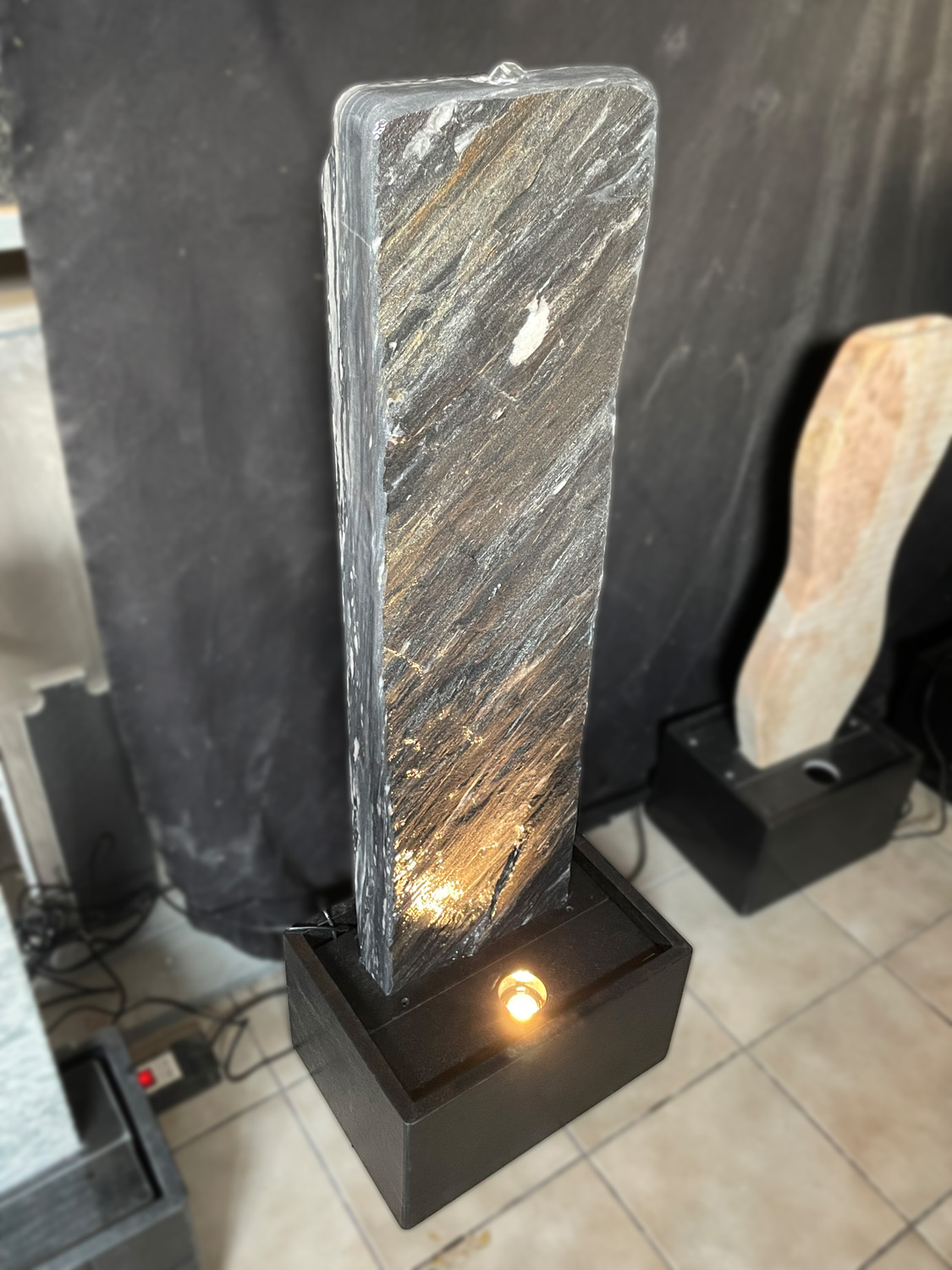 Der Brunnen besteht aus zwei Teilen. Der, mit der Standplatte verklebten Wasserwand, über die das Wasser sanft hinunter rinnt und der aus schwarzen Granit gefertigten Wanne, welche als Wasserreservoir dient. In der Granit-Wanne werden die Qualitätspumpe und auch der leicht zugängliche Unterwasserscheinwerfer platziert.