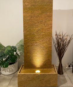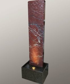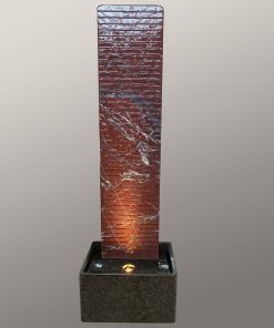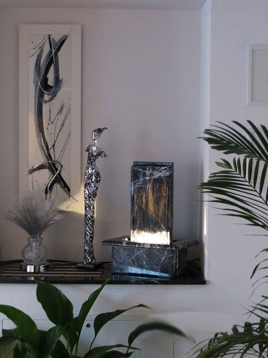 Der Brunnen besteht aus zwei Teilen. Die, mit der Standplatte verklebte Wasserwand über die das Wasser sanft hinunterrinnt und das aus dem gleichen Plattenmaterial gefertigte Becken, welches als Wasserreservoir dient. Hier im Becken sitzt die Unterwasserpumpe und auch das Unterwasserlicht, welches duch eine kleine Öffnung in der Standplatte nach oben strahlt. Das Wasser zirkuliert stetig. Es muss lediglich die verdunstete Wassermenge ergänzt werden.