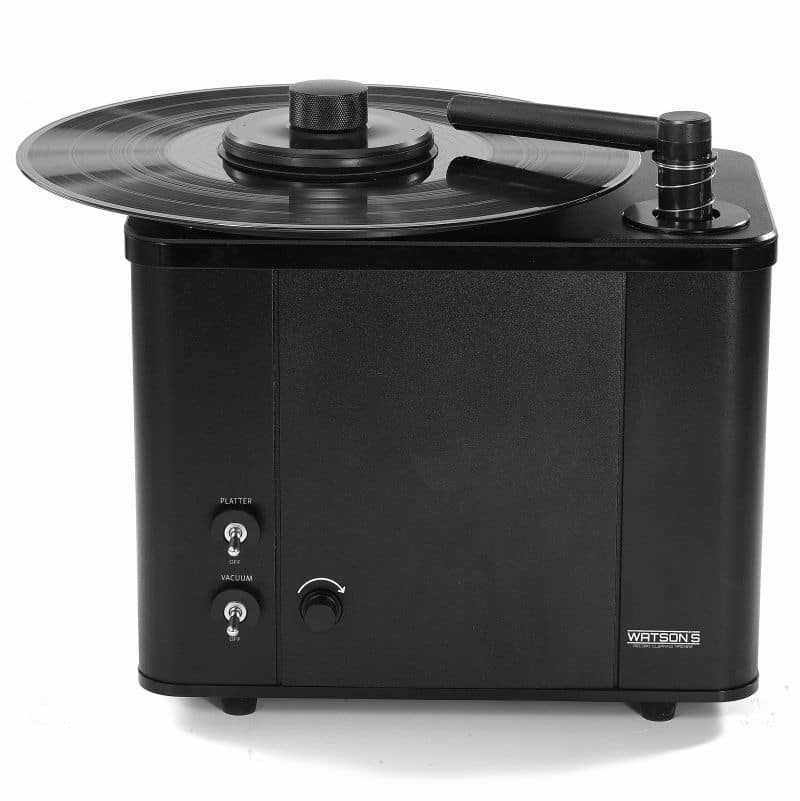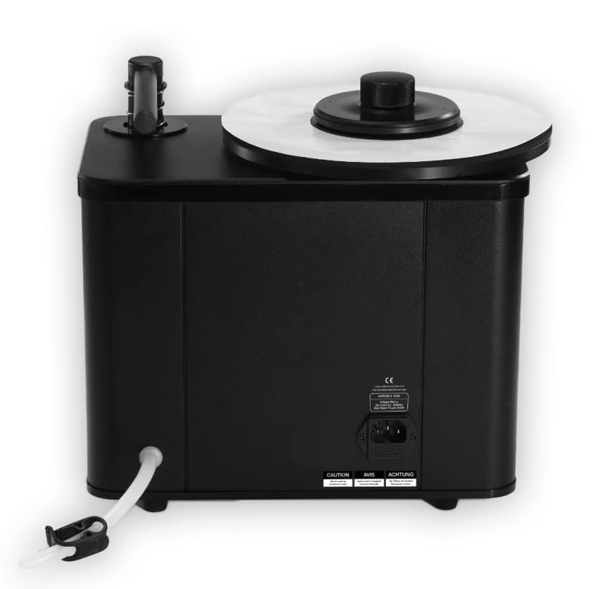 Die Plattenwaschmaschine von Watson´s besteht aus einem massiven Leichtmetallkorpus mit den Abmessungen 305 x 285 x 300mm, dem kräftigen Antrieb mit Plattenklemme und einer wirkungsvollen Absaugung. Die Platte wird einfach auf den Drehteller aufgelegt, mit der Klemme festgemacht und mit dem oberen Schalter gestartet. Dabei verhindert die Klemme eine Befeuchtung des Labels und dass die Platte durchrutscht. Eine Bürste dient zur Verteilung der Reinigungsflüssigkeit und Säuberung der Oberfläche. Der untere Schalter ist für die Saugfunktion, eine gründliche Trocknung ist nach wenigen Umdrehungen erreicht. Mit einem zusätzlichen Drehknopf lässt sich die Saugkraft inividuell einstellen. Selbstverständlich gehören ein Netzkabel, ein Saugarm für herkömmliche 30 cm-Schallplatten, die Plattenklemme und die Bürste zum Lieferumfang. Für kleinere Platten mit 7 Zoll oder 10 Zoll Durchmesser sind kürzere Arme erhältlich.
